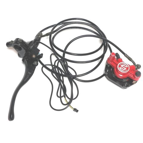 Alkuperäinen takajarru malliin Sähköskootteri FAT 2.0 2022. Jarru sisältää nestejarrukahvan, nesteletkut, jarrusatulan sekä jarrupalat.