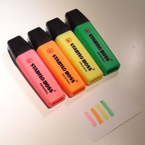 Huomiokynä, merkintä, merkintäkynä, korostus, korostuskynä, opiskelu, Stabilo, highlighter, Schneider, Staedtler, FriXion