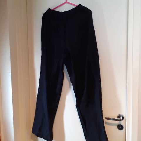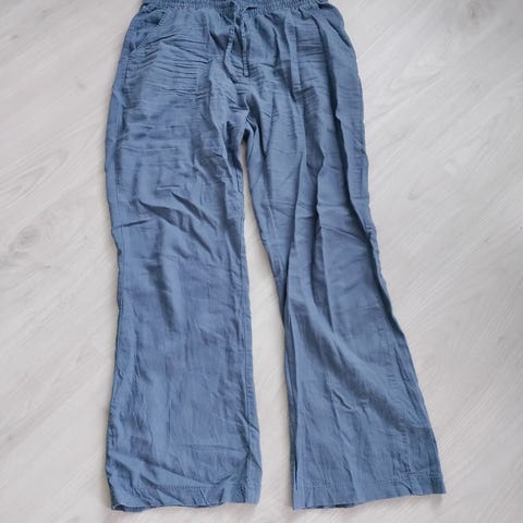 Kerran käytetyt, kuin uudet pellavahousut. Todella hyvät, joustavalla trikoisella kuminauha vyötäröllä, kiristysnauha. Suoralahje. Vyötärön leveys noin 37 cm, mutta venyy helposti 43 cm. Säilytyksestä taitoksia, mutta silittämällä oikenee.