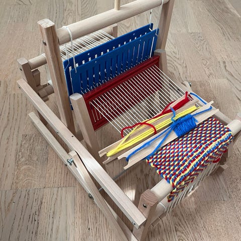 Työleveys on noin 15 cm ja puulelu on suunniteltu yli 3‑vuotiaille. Tämä kokonaisuus innostaa kutomaan mattoja, alustoja tai pieniä nukkekotitekstiilejä, ja kehittää hienomotoriikkaa, keskittymiskykyä sekä visuaalista luovuutta.