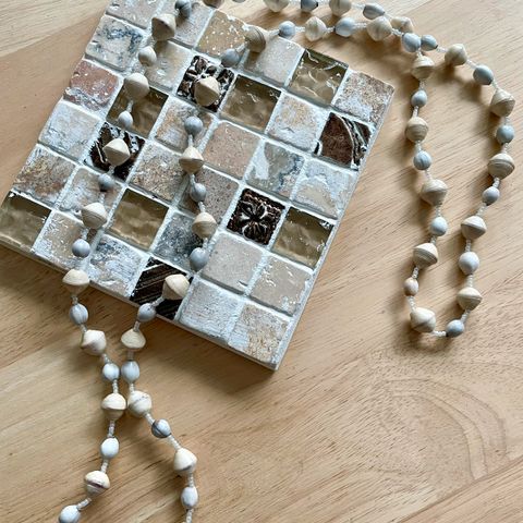 Kaunis bambu puinen kaulakoru, jossa on Fehu-riimu (ᚠ) kaiverrettuna.