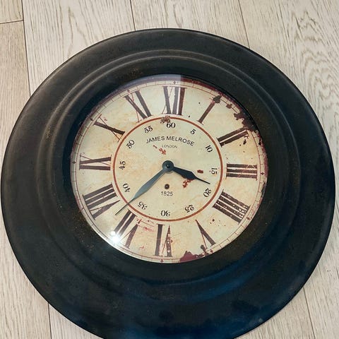 Kello on hyvässä kunnossa, ollut seinällä hetken. Viisareissa pientä vääntymää, jonka näkee sivukuvasta. Ei näy edestä katsottaessa.