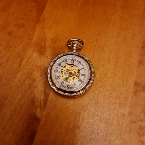 Toimiva taskukello hihnalla. Ollut vähällä käytöllä, pienen pieniä jälkiä jos tarkkaan syynää.