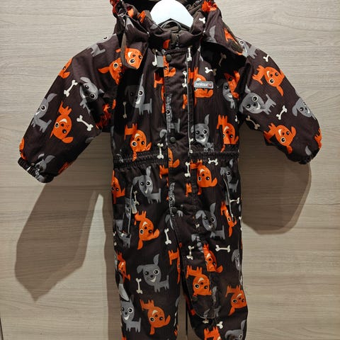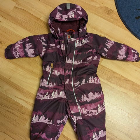 Lämmin tuulen ja vedenpitävä haalari. Muuten todella hyvässä kunnossa, mutta kankaassa muutama pieni musta viiru. En ole yrittänyt pestä kun nyt vasta ne hoksasin