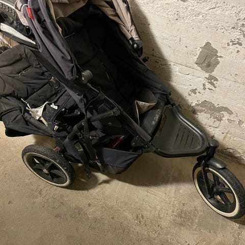 Kolmipyöräiset sisarus/tuplarattaat, alemman istuimen saa pois, ilmatäytteiset renkaat. Vain nouto.