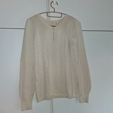 Retrotyylinen alas levenevä neulepaita kultakimaltein. Kainalo-kainalomitta 50cm ja olka-helma 62cm. Rintamuotolaskokset sivusamoissa. Vyö kuuluu mukaan. Pakettiautomaatti 6.90e