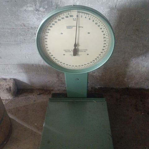 Vanha vaaka, kolmella punnuksella. Ikäisekseen ihan kuntoinen.