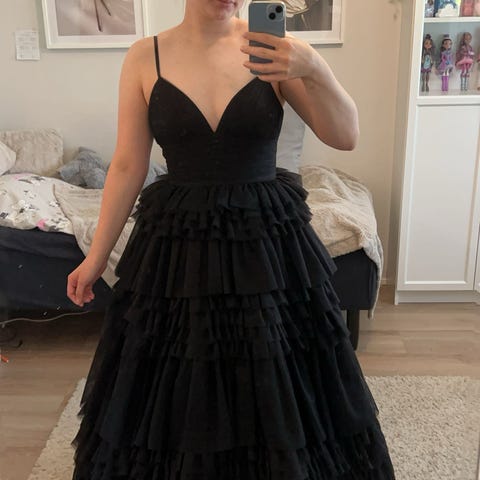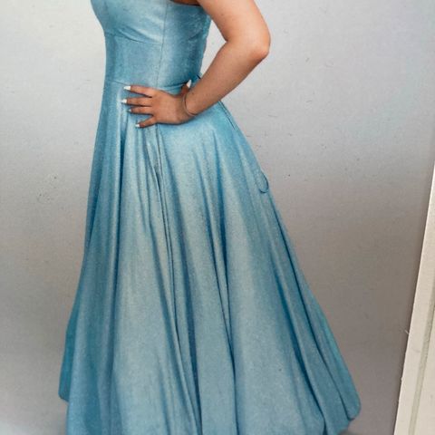 Uusi, käyttämätön satiinimekko kokoa S. Edessä kauniit venelaskokset ja paljettikangaskoriste. Selässä nyörikiinnitys, joten istuvuus ja olkainten pituus on hyvin säädettävissä.