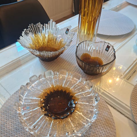 5 kpl täysin ehjiä Humppilan lasin lasilautasia, joiden halkajisija on n. 16 cm ja korkeus 2 cm. Yhdessä lautasessa lautasen reuna on jäänyt hieman ohkaisen oloiseksi valmistusvaiheessa, katso viimeinen kuva. Katso myös muut ilmoitukseni!