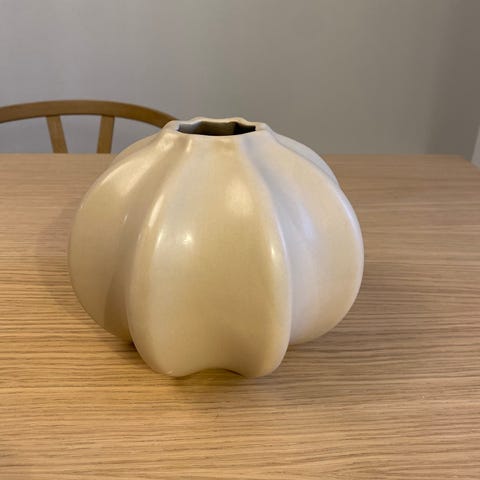 Myydään beige maljakko, jota voi käyttää monipuolisesti: maljakkona, hammasharjamukina, kynätelineenä...