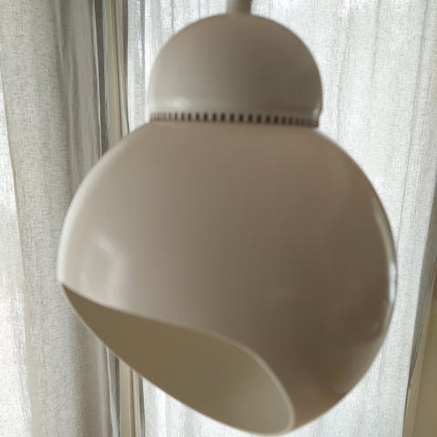 Klassikko Artekin riiippuvalaisin, valkoinen messinki renkaalla. Hyvässä kunnossa, joitain pieniä jälkiä, ei erota kun valaisin roikkuu katosta. Johtoa myös hyvin jäljellä, Artekin tarrat kattokuvussa.