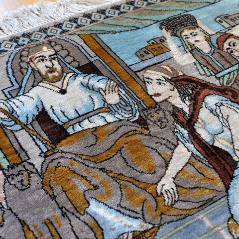 Erityistä: Matto esittää Jeesuksen ristiinnaulitsemista ja sisältää pääsiäiskertomuksen eri vaiheisiin viittaavaa symboliikkaa. Erittäin tiivisnukkainen, laadukkaasti solmittu matto. Yläkulmissa lenkit seinälle ripustamista varten.