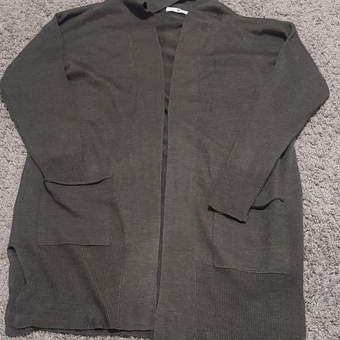 Musta-harmaa puolipitkä neuletakki. Ei juuri käytetty. Pääntiessä hakaskiinnitys, etutaskut. 15% villaa