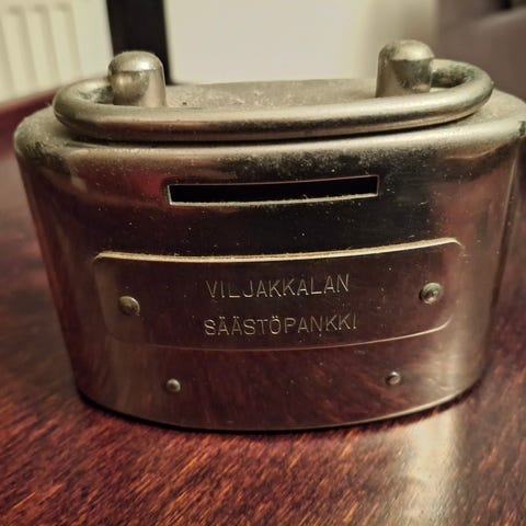 Tällainen vastaava, ihastuttava Fantti-lipasmalli on ilmestynyt alkujaan 70-luvun alkuvuosina. Kyljessä on toisella puolella valkoinen Säästöpankin logo. Muovisessa pankissa on tarrasilmät. Noin-mitat ovat: 11,5cm pituus hännänpäästä kärsänpäähän, korkeus 9cm ja syvyys vajaa 10cm. Tämä valloittava, käyttämätön sisustuselementti on vailla avainta. Sain sen aikani pähkäiltyäni auki ja kiinni kapealla ruuvimeisselillä painaen kärsän suuntaan. Täten kiintonainen muoviosa menee aukkoon ja pohjaosa lukkiutuu. Tällä metodilla aukesi myös myynnissäni oleva postipankin possu-lipas. Siis ei hätää, kun avaimilla on taipumus joutua hukkaan. Säästäväisyys on kaikkina aikoina varteenotettava neuvo jo lasta kasvatettaessa! Selailehan monenmoiset Tori-ilmoitukseni (mm. lippaita, vintagea, keräilytavaraa, nukkeja, figuureita, merkkejä, astioita, jalkineita, vaatteita, metallitavaraa) ja ryhdy tilauksen tekoon. Useampi tuote samassa paketissa kohtuullistaa postikuluja.