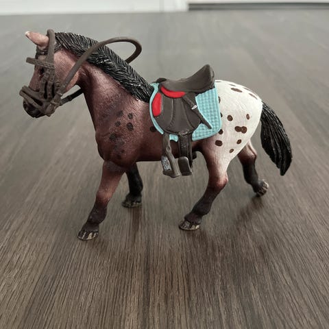 Schleich-hevonen + satula + suitset + loimi + aita