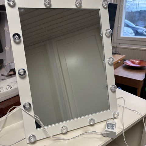 Kosmetiikkapeili normaalilla ja reilusti suurentavalla peilillä. Paristolla toimiva valo. Ei häiritsevää johtoa.