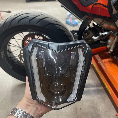 Universal LED moottoripyörän ajovalo, jossa on musta runko. Led KTM type Faster musta. LED valomaski KTM EXC.