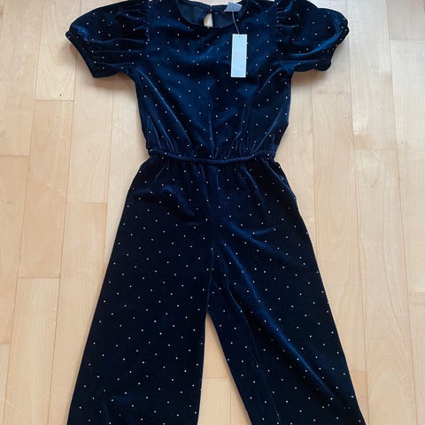 Hyväkuntoinen, tummansininen haalari, jossa valk ksimukset, rusetti, kullanväriset napit ja ruudulliset koristenauhat. Materiaali puuvillaa