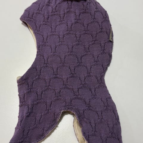 Kätevä pukea ja lämmin villainen kypärämyssy. 50% villa, 50% akryyli, sisävuori 100% puuvilla. Koko noin 2-4 vuotiaalle. Kotimainen.