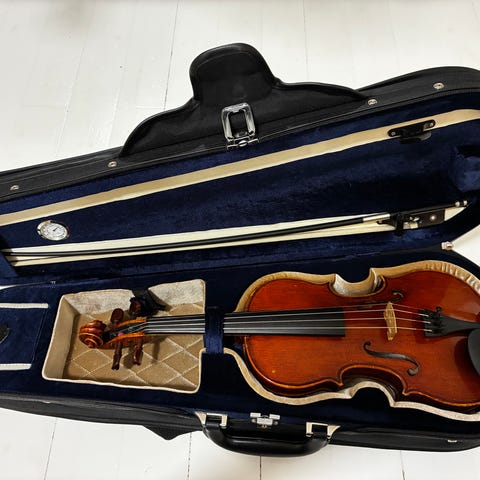 Mukaan koko setti: viulu, jousi, oivallinen kotelo sekä hartsi