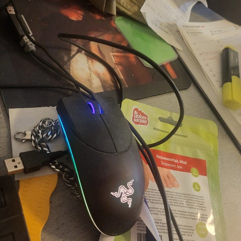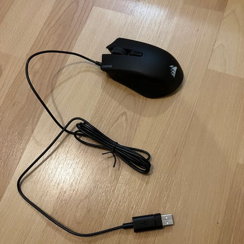 Corsair rgb pro Hiiri on musta ja siinä on USB-liitäntä. On vähän kuluma jälkeä, kaksi sivu näppäintä.
