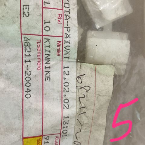 Myydään Toyotan uusi ja alkuperäinen osa, osanumero 90467-10084 (CLIP(FOR BACK DOOR TRIM BOARD)), (LB) Takaluukun sisäpuolen muovien kiinnike). Sopivuus: