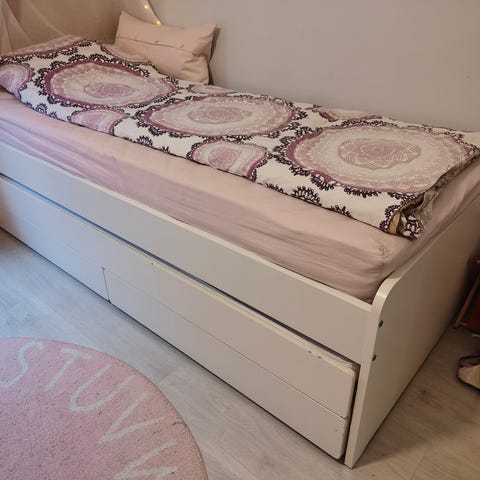 Jysk Billund sänky säilytyslaatikoilla. Laatikot ovat pyörillä. Patjan koko 90×200. Korkeus korkeimmillaan pääpäädyssä (75 cm). Nouto Siuntiosta.