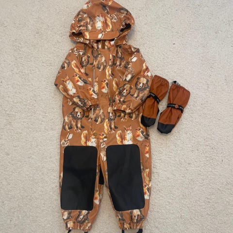 Didriksons fleecevuorellinen kurapuku 80 senttinen. Uutena meille tullut ja roikkunut päiväkodin naulakossa, mutta jotain tummentumaa on takin etumuksessa, en ole yrittänyt puhdistaa. Täysin ehjä ja käytännössä käyttämätön.