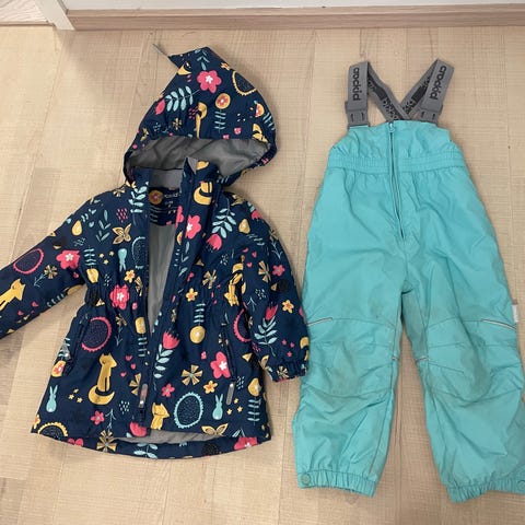 Myydään hyvässä kunnossa oleva välikausitakki, haalarit sekä kauluri. Koko on 92-98. Takin ja haalarien materiaali on vettä hylkivää.