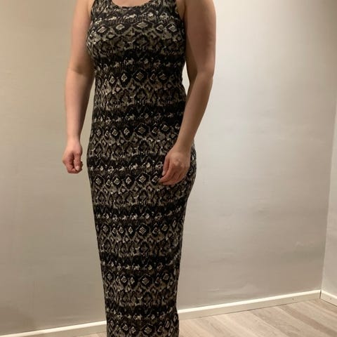 Koko: M ( kainalo-kainalo 51 cm , joustaa n. 65 cm asti , vyötärön leveys kuminauhankohdalta 37 cm , joustaa n. 63 cm asti ja kainalo-helma 112 cm )