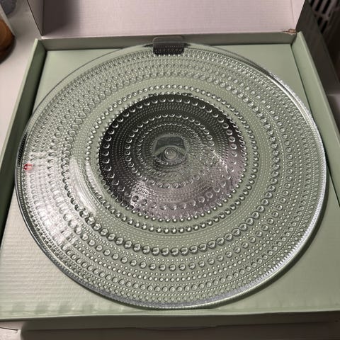 Iittala Kastehelmi kakkulautanen, valmistettu lasista. Läpinäkyvä väri ja koristeellinen helmiäismäinen kuviointi. Sopii tarjoiluun ja leivonnaisten esillepanoon.
