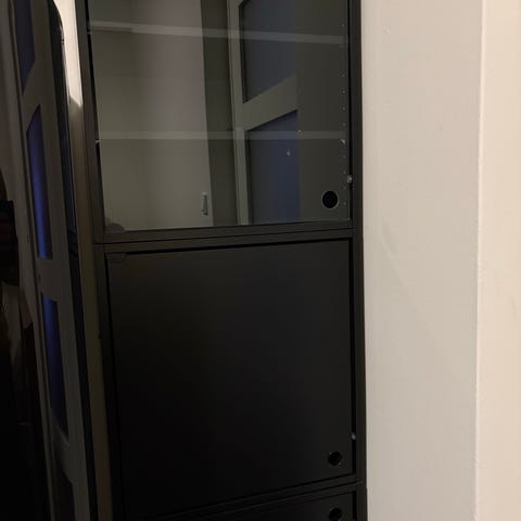 Myynnissä kolme Muuramen Nappi-elementtiä (kuvassa kaksi). Voidaan kiinnittää seinään tai käyttää lipaston tapaan. Mukaan saa halutessaan sokkelit (ei kuvassa). Kummassakin elementissä valkoinen akryyliovi sekä yksi hyllytaso.