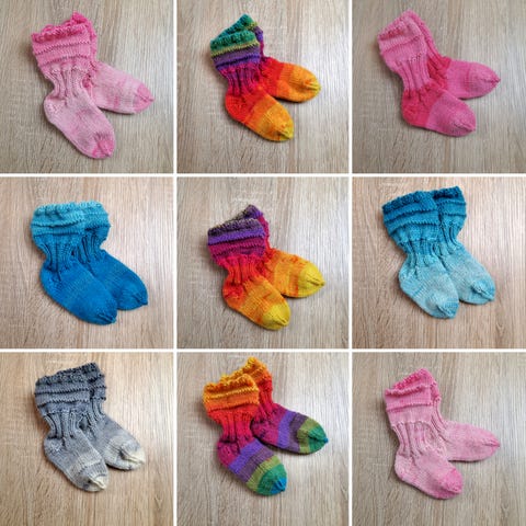 Tilaustyöt saatavana lähes kaikissa väreissä, sekä vauvansukat myös ohuemmilla akryylilangoilla.