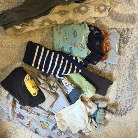 Koon 62 vaatepaketti, mukaan 3 yöpukua, 5 bodya, collegepaita, housut ja 5 paria sukkia. Muumi yökkäreissä vetoketjut, Cirafin pandayökkärissä nepparit. Name itin susibodyssa pienet reiät neppareiden vieressä, näkyy kuvassa. Collegepaidassa kätevä nepparikiinnitys. Sukat muistaakseni Name itin ja koko oli 62/68. Pesty hajusteettomasti.