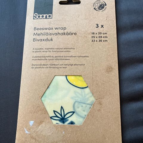 Vegaanivahakääre on kestävä vaihtoehto tuorekelmulle. Kääreessä käytetty vaha on vegaanista toisin kuin mehiläisvahakääreessä. Kääreeseen voit kietoa esimeriksi eväsleivät, kasvikset ja juustot. Kääreellä voit myös peittää jääkaappiin menossa olevat ruokakulhot. Lämmitä käärettä käsilläsi ja muotoile se tiiviisti säilöttävän tuotteen ympärille tai astian suulle.Kääre on omiaan suhteellisen kuivien ainesten sälyttämiseen, mutta lihalle ja kalalle sitä ei suositella. Älä kuumenna käärettä uunissa tai mikroaaltouunissa. Pese haalealla vedellä, tarvittaessa voit käyttää pienen määrän tiskiainetta, kuivaa lopuksi ilmavasti.Vegaanivahakääre kestää tyypillisesti aktiivista käyttöä noin vuoden, minkä jälkeen voit jatkaa tuotteen käyttöikää käsittelemällä sen uudelleen vahalla, jota myydään samoissa myyntipisteissä kuin käärettäkin. Kääreen voi hävittää leikkaamalla sen pieniksi palasiksi ja kompostoimalla tai polttokelpoisen jätteen mukana.Materiaalikoostumus: 100 % vegaaninen luomutuote - puuvilla, kandelillavaha, jojobaöljy, mäntyhartsi (pihka), kuviot painettu soijamusteella.Koot: 1 x 18 x 20cm / 2 x 30 x 30cm