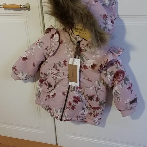 Ihana muhkea hyvässä kunnossa oleva toppatakki. Väri vaaleanpunainen valkoisilla palloilla. Ei ole pesty, koska en näe tarvetta. Vuoren alaosassa hieman tummentumaa vaatteista, näkyy kuvassa. Koko mielestäni ihan suht reilu, koska meni vielä yli 80cm tytöllemme.