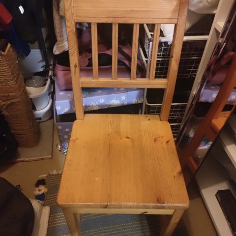 4kpl mustaksi maalattuja tuoleja, istuinosaan laitettu pieni pehmuste ja kangas.