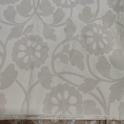 Uusi sisustuskangas, ei pesty. Kankaassa on paksuutta, joten soveltuu hyvin ryhdikkääksi tyynypalaksi. Ei välttämättä kestävä verhoilussa. Kuviossa ornamentti ja näkisin tämän hyvinkin ylellisenä sisustustyynynä. Tarkkaa kuitusisältöä minulla ei valitettavasti ole.