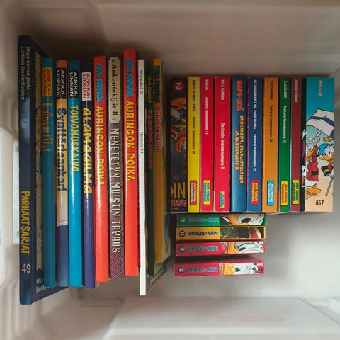 Hyväkuntoisia (suurin osa), osa ei kertaakaan luettuja Aku Ankka-kirjoja, jokunen taskukirja sekä Roope-setä-kirja. Lisäksi Aku Ankka-lehtiä lähinnä 1990-2010-luvuilta. Kuvissa vain osa kirjoista. Kirjat 12kpl = 20e, Aku Ankka-lehdet =10e/kassi (S-marketin kestokassi).