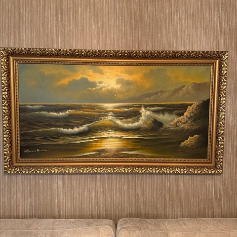 Merimaisema maalaus, joka kuvaa voimakkaasti aaltoilevaa merta ja kiveä. Maalaus on kehystetty koristeellisella kultaisella kehyksellä, joka lisää teoksen arvokkuutta. Sopii hyvin sisustuselementiksi tai taidekokoelmaan.