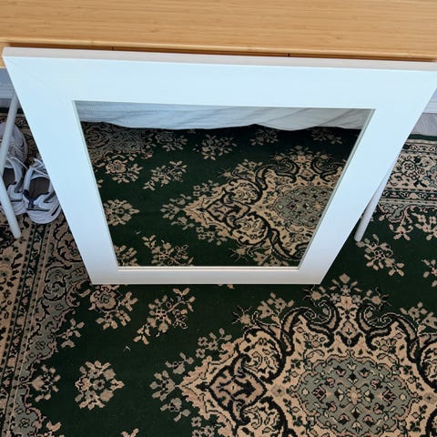 Puukehyksinen lasitettu (kuvakoko 63 × 63 cm) raami. Puussa hieman kulumisen jälkiä. Vain nouto.