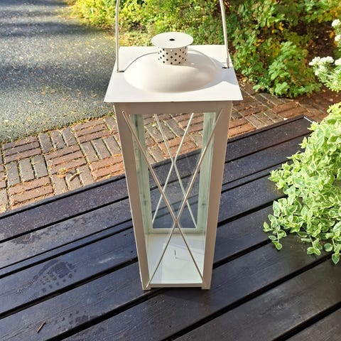 Roikkuva, kerman värinen metallilyhty lasilla. Pituus n.77cm josta lasi n.22cm