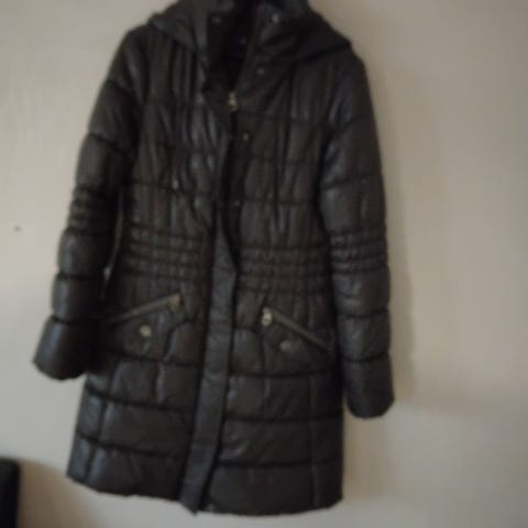 Kuvissa näkyy muutamia tummia jälkiä hihoissa ja helmassa, jotka ovat huomioitu hinnassa. Myös sisäosan merkki on hieman kulunut.