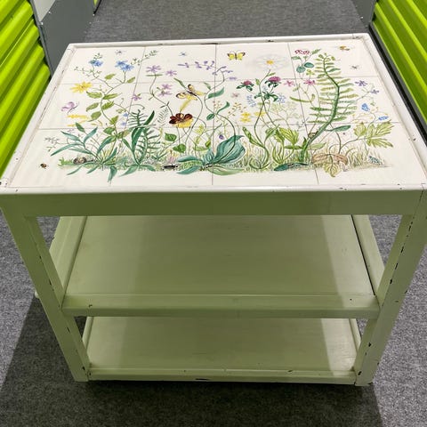 Myydään valkoinen kuvan kaakelipöytä uutena.