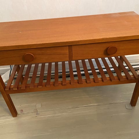 Nätti 60-luvun tiikki pöytä myytävänä. Tason päällä pois nostettava pieni hylly. Yleiskunto ikäisekseen hyvä. Muutamia ajan tuomia jälkiä löytyy jaloissa. Ei hajuja.