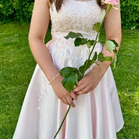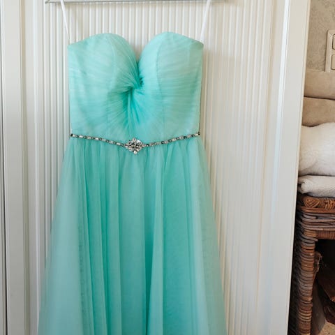 Ostettu kerran käytettynä ja itse kerran käytetty, minkä jälkeen pesty. Kauniisti laskeutuva malli, selässä nyöritys ja vetoketju. Piilotaskut molemmin puolin sivuissa. Sisällä ohut vuori ja rinnan kohdalla kevyt toppaus.