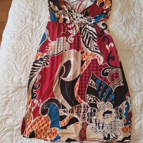 Vihreäsävyinen spagettiolkainmekko, jossa värikkäitä egyptiaiheisia kuvioita. Vyötäröllä taakse solmittavat nauhat ja helmassa solmitut hapsut. Kokomerkintää ei ole, mutta arvelisin sopivan parhaiten S-kokoiselle. Tässä vielä tarkempia mittoja: pituus olka-helma noin 100 cm, kainalo-kainalo 42.5 cm, leveys vyötärönauhan kohdalta noin 42 cm. Erittäin siistikuntoinen, ei moittimista.