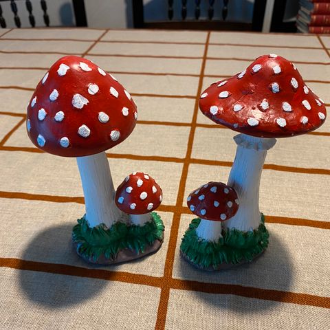 Myynnissä kuvien ehjät sienikoristeet. Pituus on molemmilla 17,5 cm, materiaali on muovikomposiitti. Sienten hatut ovat hieman erilaisia. Hinta on yhdellä 18 e, molemmat yhteensä 35 e, lähetys on 7 e, kulkeutuvat myös Turkuun