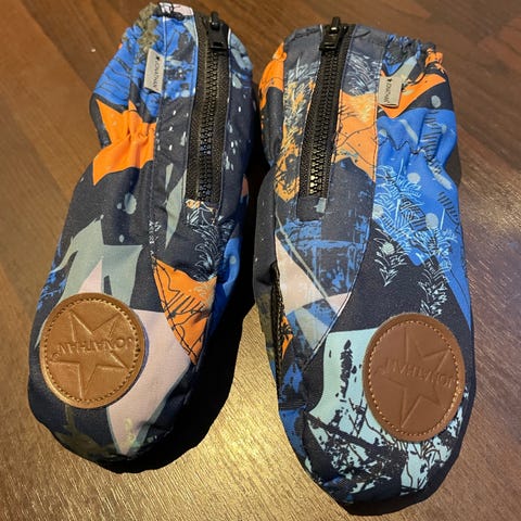 Jonathanin ihanan muhkeat talvihanskat. Mielestäni hanskat ovat ennemmin vettähylkivät kuin vedenpitävät. Pientä reiänalkua peukaloissa. Vuori on paikoittain kulunut (ks. kuvat). Muuten nämä ovat hyvät ja lämpimät.