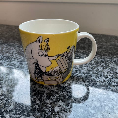 Niiskuneiti ja aarrearkku keltainen Muumimukit 2kpl. Toinen on uudenveroinen ilman tarraa, toinen on aikoinaan ollut käytössä ja hieman kolhiintunut, ei tarraa.